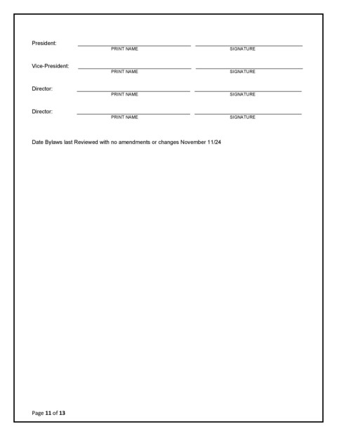 Date Bylaws last Reviewed with no amendments or changes November 11/24