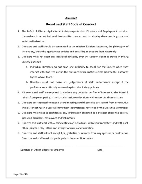 1. The DeBolt & District Agricultural Society expects their Directors and Employees to conduct